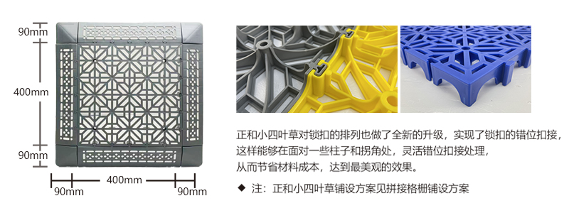 正和小四葉草采用通扣設(shè)計(jì),可以確保產(chǎn)品鋪設(shè)完成后在任何區(qū)域單獨(dú)取出,極大的方便了客戶后期局部清理泥沙等,給店面的日常衛(wèi)生維護(hù)提供了很好的基礎(chǔ)。