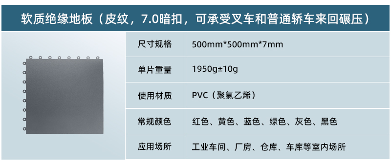 軟質(zhì)絕緣地板采用純新軟性PVC(聚氯乙烯)生產(chǎn)而成,具有防滑、防油、靜音、抗沖擊、高承載等特點,可以快捷安裝在任何現(xiàn)有的基板,包括木材,混凝土,環(huán)氧樹脂,瓷磚,水磨石等,廣泛應用于車間廠房地面、倉庫地面、車庫地面、健身房、展廳等場所。