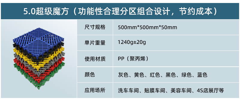 超級(jí)魔方產(chǎn)品綜合了以前產(chǎn)品的所有優(yōu)點(diǎn),包括結(jié)構(gòu)設(shè)計(jì)、防滑紋路、尺寸間距、加大鎖扣、矩陣支撐等,將產(chǎn)品厚度提升到60毫米的超高厚度,真正的實(shí)現(xiàn)了汽車店鋪的免挖溝鋪設(shè)。
